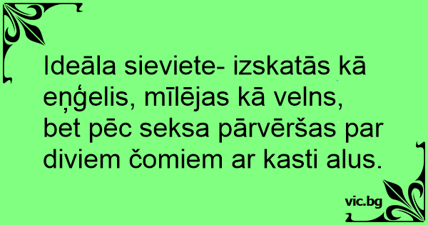 Ideāla sieviete- izskatās kā eņģelis, mīlējas kā velns, bet pēc seksa pārvēršas par diviem čomiem ar kasti alus.