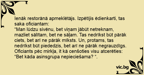 Ienāk restorānā apmeklētājs. Izpētījis ēdienkarti, tas saka oficiantam: