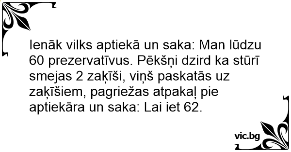 Ienāk vilks aptiekā un saka: Man lūdzu 60 prezervatīvus. Pēkšņi dzird ka stūrī smejas 2 zaķīši, viņš paskatās uz zaķīšiem, pagriežas atpakaļ pie aptiekāra un saka: Lai iet 62.