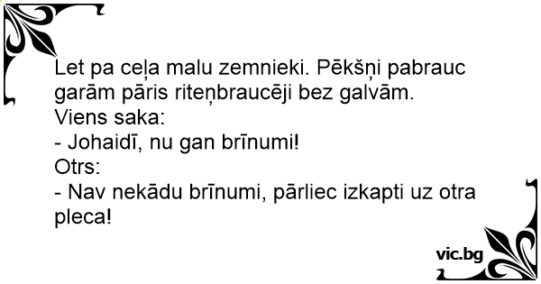 Jedzie chłop razem z babą wozem. Jadą tak, jadą i chłop patrzy - wymija ich rowerzysta bez głowy. Chłop nic sobie z tego nie robi i jedzie dalej. Patrzy a tutaj motorowerzysta bez głowy ich wymija. Chłop dalej olewa sytuację. Jadą dalej, patrzy a tutaj motocyklista bez głowy, jeden, drugi,...