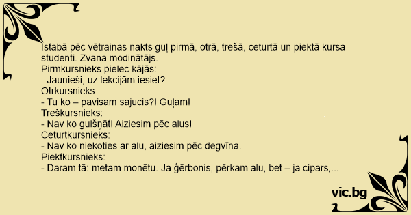 Istabā pēc vētrainas nakts guļ pirmā, otrā, trešā, ceturtā un piektā kursa studenti. Zvana modinātājs.
