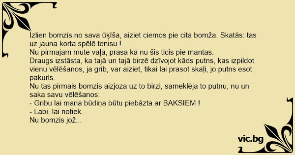 Nu tas pirmais bomzis aizjoza uz to birzi, sameklēja to putnu, nu un saka savu vēlēšanos: