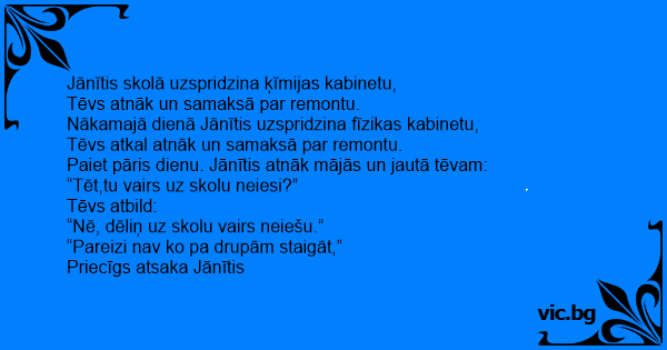 Paiet pāris dienu. Jānītis atnāk mājās un jautā tēvam: