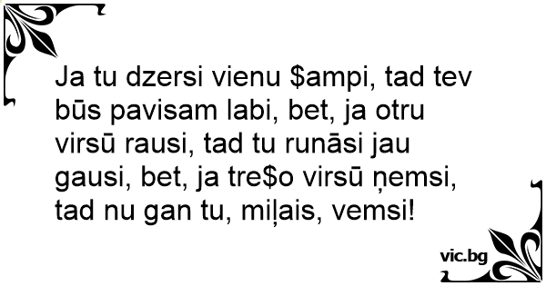 Ja tu dzersi vienu $ampi, tad tev būs pavisam labi, bet, ja otru virsū rausi, tad tu runāsi jau gausi, bet, ja tre$o virsū ņemsi, tad nu gan tu, miļais, vemsi!