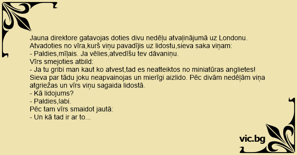 Jauna direktore gatavojas doties divu nedēļu atvaļinājumā uz Londonu. Atvadoties no vīra,kurš viņu pavadījis uz lidostu,sieva saka viņam: