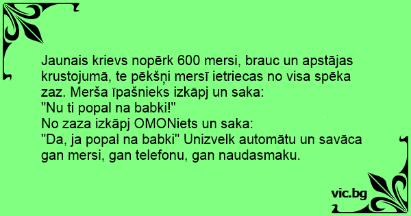 Jaunais krievs nopērk 600 mersi, brauc un apstājas krustojumā, te pēkšņi mersī ietriecas no visa spēka zaz. Merša īpašnieks izkāpj un saka: