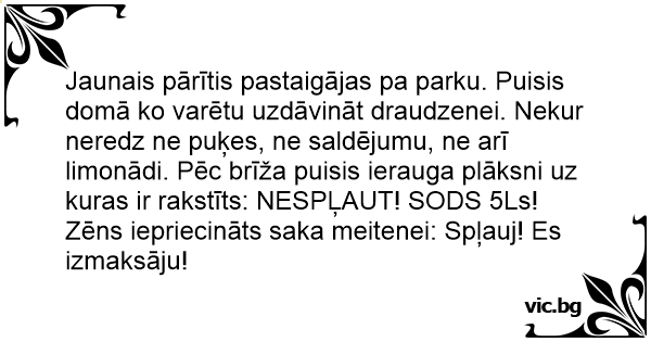 Jaunais pārītis pastaigājas pa parku. Puisis domā ko varētu uzdāvināt draudzenei. Nekur neredz ne puķes, ne saldējumu, ne arī limonādi. Pēc brīža puisis ierauga plāksni uz kuras ir rakstīts: NESPĻAUT! SODS 5Ls!