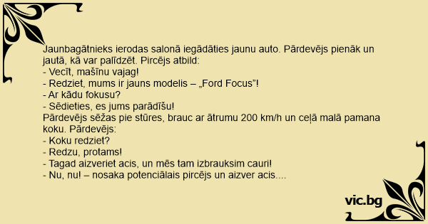 Jaunbagātnieks ierodas salonā iegādāties jaunu auto. Pārdevējs pienāk un jautā, kā var palīdzēt. Pircējs atbild: