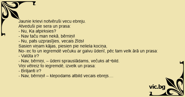 Jaunie krievi notvēruši vecu ebreju. Atveduši pie sera un prasa: - Nu, Ka atpirksies? - Nav taču man nekā, bērniņi! - Nu, pats uzprasījies, vecais žīds! Sasien viņam kājas, piesien pie neliela kociņa, No-:ec to un iegremdē večuku ar galvu ūdenī, pēc tam velk ārā un prasa: - Valūta ir? - Nav, bērniņi, – ūdeni sprauslādams, večuks at¬bild. Viņi vēlreiz to iegremdē, izvelk un prasa: - Briljanti ir? - Nav, bērniņi! – klepodams atbild vecais ebrejs. Vēlreiz iegremdē, rauj ārā un atkal prasa: - Vecmeistaru gleznas ir? - Jūs paturiet maķenīt ilgāk, Ūdens tik duļķains, ka neko nevar saredzēt…
