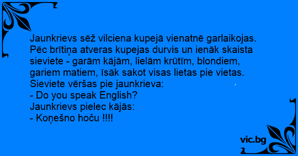 Jaunkrievs sēž vilciena kupejā vienatnē garlaikojas. Pēc brītiņa atveras kupejas durvis un ienāk skaista sieviete - garām kājām, lielām krūtīm, blondiem, gariem matiem, īsāk sakot visas lietas pie vietas.