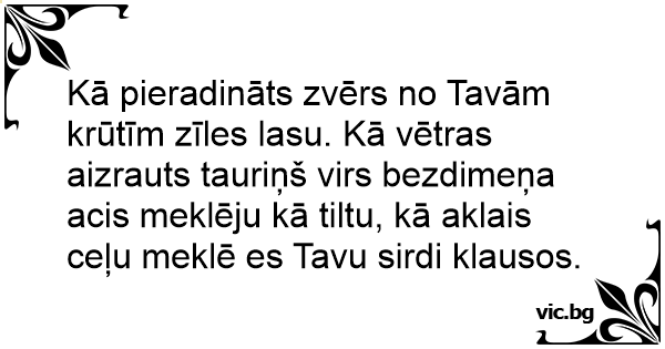 Kā pieradināts zvērs no Tavām krūtīm zīles lasu. Kā vētras aizrauts tauriņš virs bezdimeņa acis meklēju kā tiltu, kā aklais ceļu meklē es Tavu sirdi klausos.