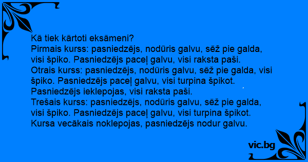 Trešais kurss: pasniedzējs, nodūris galvu, sēž pie galda, visi špiko. Pasniedzējs paceļ galvu, visi turpina špikot. Kursa vecākais noklepojas, pasniedzējs nodur galvu.