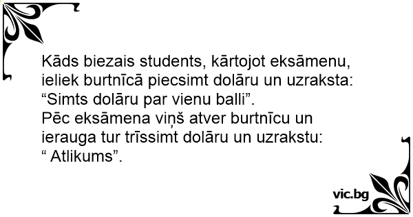 Kāds biezais students, kārtojot eksāmenu, ieliek burtnīcā piecsimt dolāru un uzraksta: