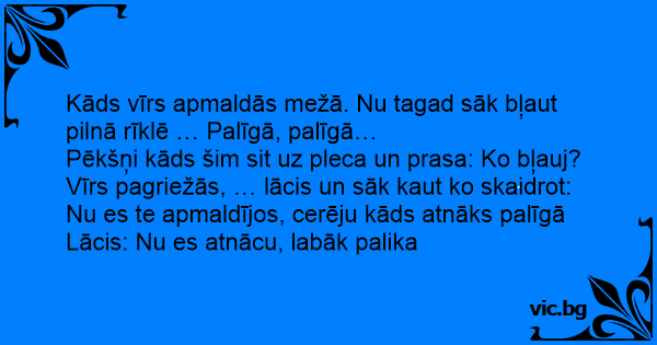 Kāds vīrs apmaldās mežā. Nu tagad sāk bļaut pilnā rīklē … Palīgā, palīgā…