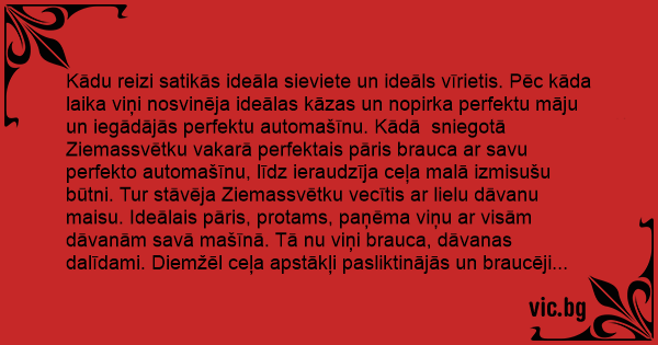 Kādu reizi satikās ideāla sieviete un ideāls vīrietis. Pēc kāda laika viņi nosvinēja ideālas kāzas un nopirka perfektu māju un iegādājās perfektu automašīnu. Kādā sniegotā Ziemassvētku vakarā perfektais pāris brauca ar savu perfekto automašīnu, līdz ieraudzīja ceļa malā izmisušu būtni. Tur stāvēja Ziemassvētku vecītis ar lielu dāvanu maisu. Ideālais pāris, protams, paņēma viņu ar visām dāvanām savā mašīnā. Tā nu viņi brauca, dāvanas dalīdami. Diemžēl ceļa apstākļi pasliktinājās un braucēji cieta autokatastrofā.