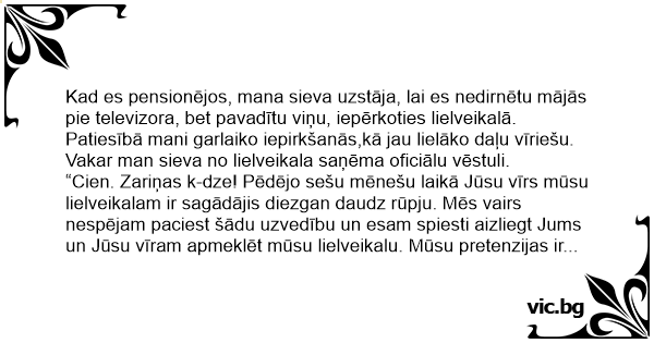 “Cien. Zariņas k-dze! Pēdējo sešu mēnešu laikā Jūsu vīrs mūsu lielveikalam ir sagādājis diezgan daudz rūpju. Mēs vairs nespējam paciest šādu uzvedību un esam spiesti aizliegt Jums un Jūsu vīram apmeklēt mūsu lielveikalu. Mūsu pretenzijas ir uzskaitītas zemāk un ir fiksētas lielveikala novērošanas kamerās.