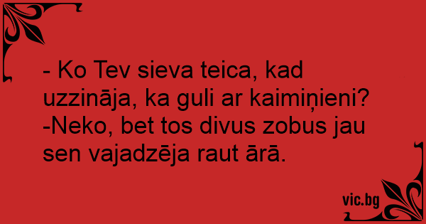 - Ko Tev sieva teica, kad uzzināja, ka guli ar kaimiņieni? -Neko, bet tos divus zobus jau sen vajadzēja raut ārā.