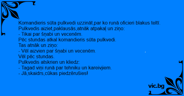 Pulkvedis aiziet,paklausās,atnāk atpakaļ un ziņo: