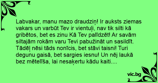 Labvakar, manu mazo draudziņ! Ir auksts ziemas vakars un varbūt Tev ir vientuļi, nav tik silti kā gribētos, bet es zinu Kā Tev palīdzēt! Ar savām siltajām rokām varu Tevi pabužināt un sasildīt. Tādēļ nēsi tāds nonīcis, bet stāvi taisni! Turi degunu gaisā, bet sargies iesnu! Un nēj laukā bez mētelīša, lai nesaķertu kādu kaiti....