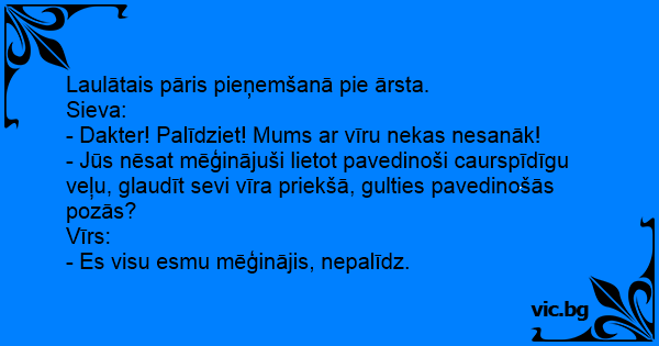 - Dakter! Palīdziet! Mums ar vīru nekas nesanāk!
