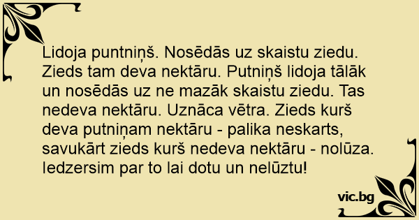 Lidoja puntniņš. Nosēdās uz skaistu ziedu. Zieds tam deva nektāru. Putniņš lidoja tālāk un nosēdās uz ne mazāk skaistu ziedu. Tas nedeva nektāru. Uznāca vētra. Zieds kurš deva putniņam nektāru - palika neskarts, savukārt zieds kurš nedeva nektāru - nolūza.