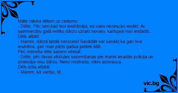- Dēliņ, pēc tavas vēstules saņemšanas pie manis ieradās policija un izrakņāja visu dārzu. Neko neatrada, nikni aizbrauca.