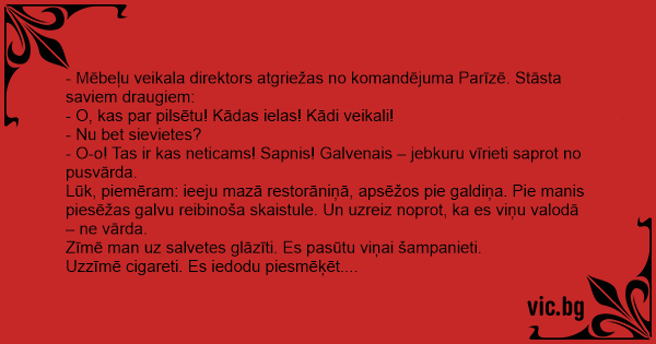 - Mēbeļu veikala direktors atgriežas no komandējuma Parīzē. Stāsta saviem draugiem: