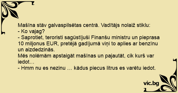 - Saprotiet, teroristi sagūstījuši Finanšu ministru un pieprasa 10 miljonus EUR, pretējā gadījumā viņi to aplies ar benzīnu un aizdedzinās.