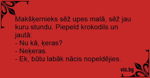 Makšķernieks sēž upes malā, sēž jau kuru stundu. Piepeld krokodils un jautā: