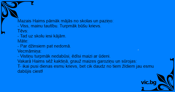 Mazais Haims pārnāk mājās no skolas un paz­iņo: