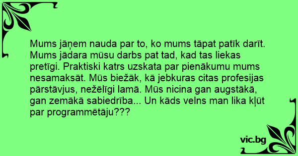 Mums jāņem nauda par to, ko mums tāpat patīk darīt. Mums jādara mūsu darbs pat tad, kad tas liekas pretīgi. Praktiski katrs uzskata par pienākumu mums nesamaksāt. Mūs biežāk, kā jebkuras citas profesijas pārstāvjus, nežēlīgi lamā. Mūs nicina gan augstākā, gan zemākā sabiedrība... Un kāds velns man lika kļūt par programmētāju???
