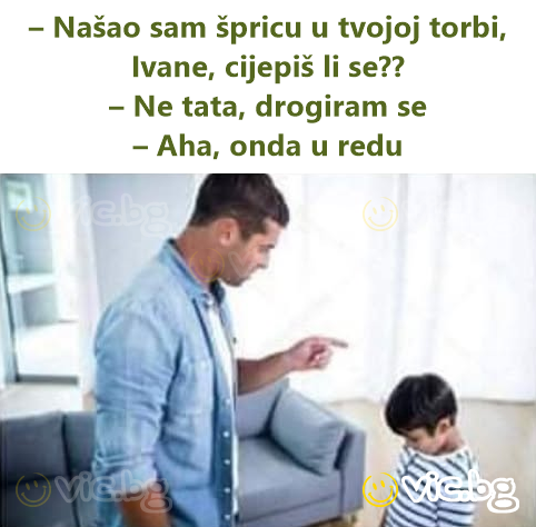 – Найдов шприц во твојата торба, Петар, се вакцинираш?? – Не тато, се дрогирам – А, добро тогаш