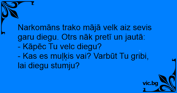 Narkomāns trako mājā velk aiz sevis garu diegu. Otrs nāk pretī un jautā:
