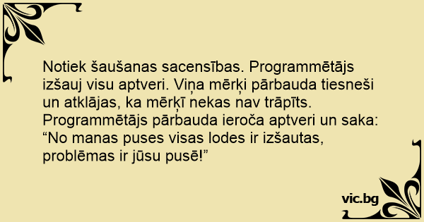 Notiek šaušanas sacensības. Programmētājs izšauj visu aptveri. Viņa mērķi pārbauda tiesneši un atklājas, ka mērķī nekas nav trāpīts.