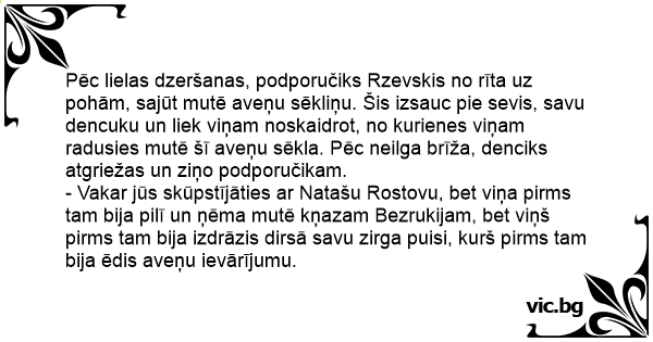 - Vakar jūs skūpstījāties ar Natašu Rostovu, bet viņa pirms tam bija pilī un ņēma mutē kņazam Bezrukijam, bet viņš pirms tam bija izdrāzis dirsā savu zirga puisi, kurš pirms tam bija ēdis aveņu ievārījumu.