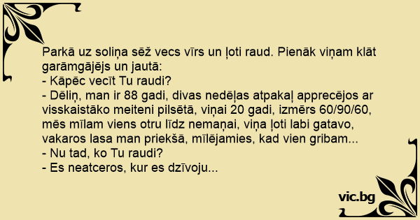 - Dēliņ, man ir 88 gadi, divas nedēļas atpakaļ apprecējos ar visskaistāko meiteni pilsētā, viņai 20 gadi, izmērs 60/90/60, mēs mīlam viens otru līdz nemaņai, viņa ļoti labi gatavo, vakaros lasa man priekšā, mīlējamies, kad vien gribam...