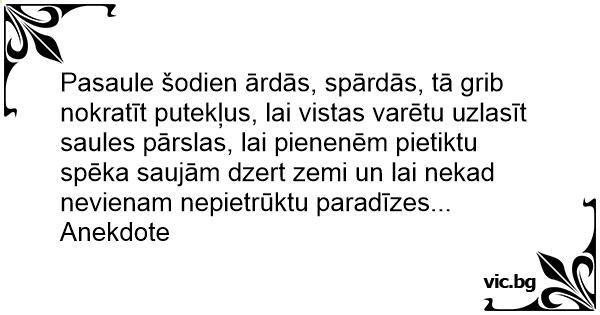 Pasaule šodien ārdās, spārdās, tā grib nokratīt putekļus, lai vistas varētu uzlasīt saules pārslas, lai pienenēm pietiktu spēka saujām dzert zemi un lai nekad nevienam nepietrūktu paradīzes...