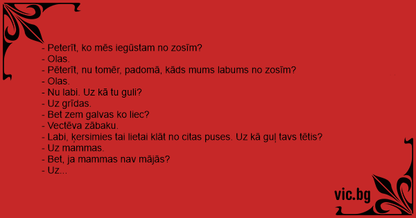 - Labi, mēģināsim vēlreiz. Uz kā guļ tavs vectētiņš??