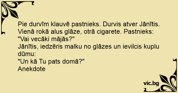 Pie durvīm klauvē pastnieks. Durvis atver Jānītis. Vienā rokā alus glāze, otrā cigarete. Pastnieks: