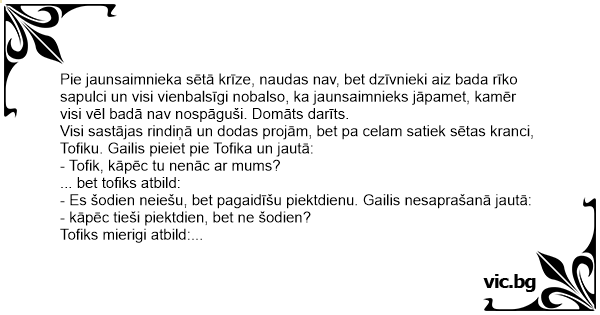 - Es vakar dzirdeju, kā saimnieks teica, "ja mēs līdz piektdienai nedabūsim naudu, tad varēsim Tofikam pimpi sūkāt."