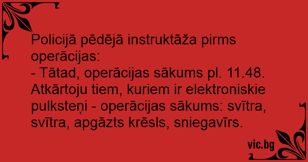 - Tātad, operācijas sākums pl. 11.48. Atkārtoju tiem, kuriem ir elektroniskie pulksteņi - operācijas sākums: svītra, svītra, apgāzts krēsls, sniegavīrs.
