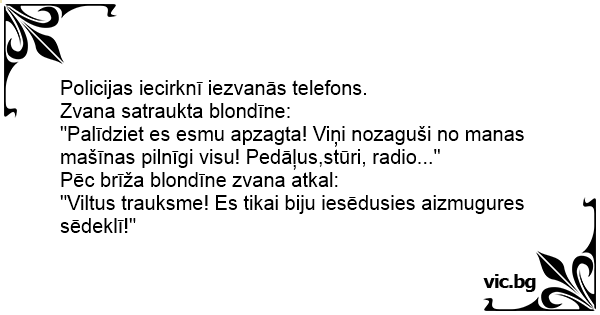 "Palīdziet es esmu apzagta! Viņi nozaguši no manas mašīnas pilnīgi visu! Pedāļus,stūri, radio..."