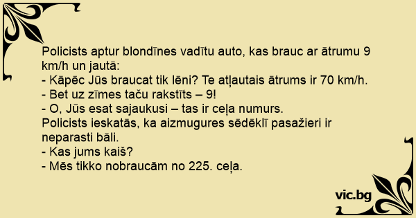 Policists aptur blondīnes vadītu auto, kas brauc ar ātrumu 9 km/h un jautā: