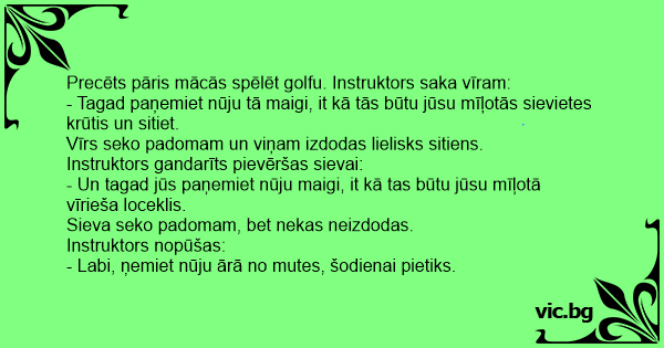 Sot si sotie pentru primadatã la golf. Angajeazã un instructor care sã le arate ce si cum. Instructorul, il ia mai intai pe sot. Vede cam ce poate,apoi il invatã: - Uitati, asezati-vã asa, cu...