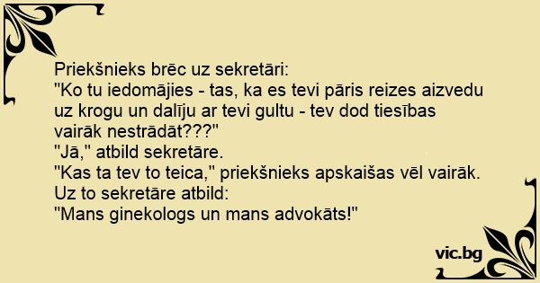 Влиза секретарка при шефа и казва: Chiste de la secretaria y el lio con el jefe Секретарка влезнала в кабинета на шефа си и казала: "Wer", tobt der Chef zu seiner Sekretärin, "hat Ihnen eigentlich gesagt, dass Sie hier den ganzen Tag faulenzen können, nur weil ich sie ein paarmal geküsst habe?" Орет новый русский на секретаршу: Der Chef ist sauer auf seine Sekretärin: "Wer hat Ihnen eigentlich gesagt, daß Sie hier im Büro nur faul herumhängen können, bloß weil ich Sie auf dem letzten Betriebsfest vernascht habe?" "Mein Anwalt!" Direktören till sekreteraren: - Vem har sagt att ni kan bära er åt hur som helst bara för att jag har kysst er ett par gånger? - Min advokat! Секретарката влегува кај шефот и вели: - Од овој момент платата ќе ми биде 1000 евра и ќе имам 4 слободни денови во неделата... Шефот со сарказам: - А кој ти го рече тоа мила? - Мојот гинеколог, а... El jefe le dice a la secretaria: - Oye, ¿pero a ti quién te ha dicho que puedes pasarte dando vueltas todo el día sin trabajar, sólo porque nos acostamos una noche? - Mi abogado...Cupones y... Jefe: ¿ Quién te ha dicho que puedes pasarte dando vueltas sin trabajar todo El día, sólo porque tuvimos un rollo? Secretaria: Mi abogado... Firmos savininkas rėkia ant sekretorės: - Tu ką čia dabar išsigalvoji? Manai, kad jei porą kartų tave nusivedžiau į kavinę ir į lovą pasiguldžiau, tai gali nedirbti?! - Taip! - atsako sekretorė. -...