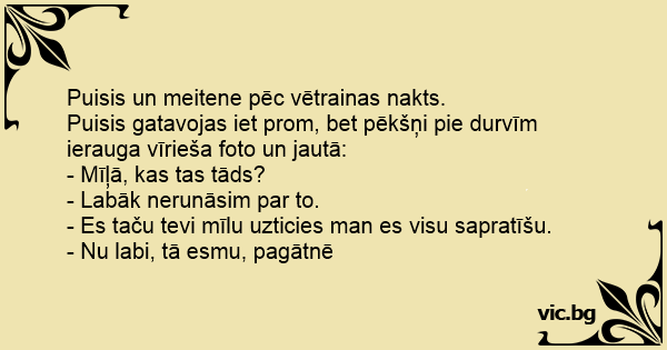 Puisis gatavojas iet prom, bet pēkšņi pie durvīm ierauga vīrieša foto un jautā: