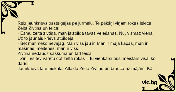 Reiz jaunkrievs pastaigājās pa jūrmalu. Te pēkšņi viņam rokās ieleca Zelta Zivtiņa un teica: