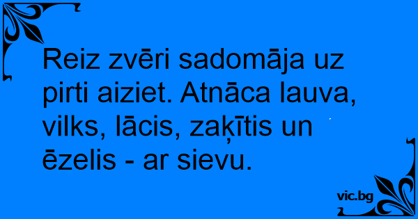 Reiz zvēri sadomāja uz pirti aiziet. Atnāca lauva, vilks, lācis, zaķītis un ēzelis - ar sievu.