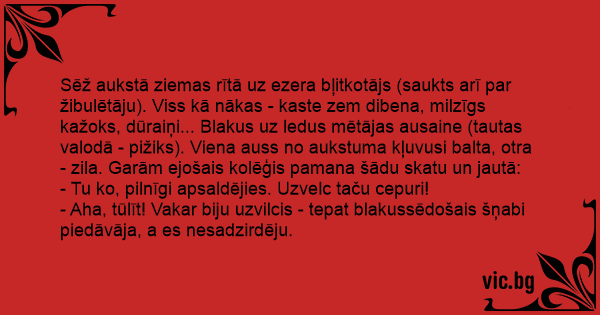 Sēž aukstā ziemas rītā uz ezera bļitkotājs (saukts arī par žibulētāju). Viss kā nākas - kaste zem dibena, milzīgs kažoks, dūraiņi... Blakus uz ledus mētājas ausaine (tautas valodā - pižiks). Viena auss no aukstuma kļuvusi balta, otra - zila. Garām ejošais kolēģis pamana šādu skatu un jautā: