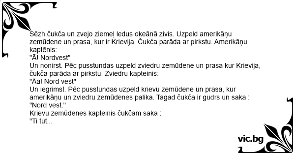 Un iegrimst. Pēc pusstundas uzpeld krievu zemūdene un prasa, kur amerikāņu un zviedru zemūdenes palika. Tagad čukča ir gudrs un saka :